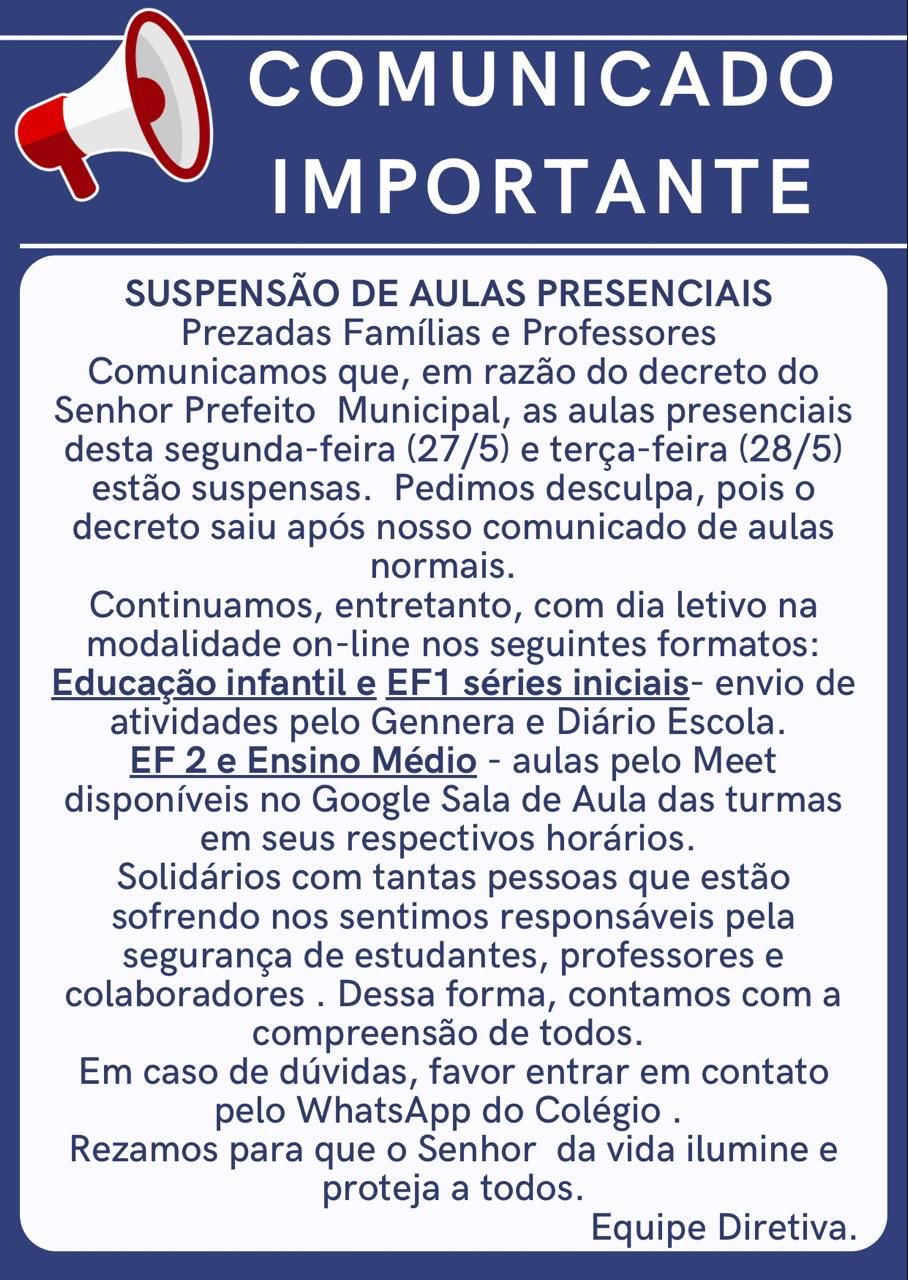 Comunicado sobre o Decreto de suspensão das aulas – 27/05🌧️