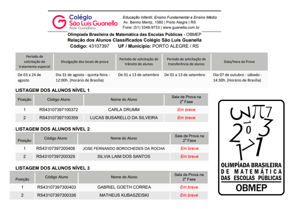 Veja a lista os estudantes aprovados para a segunda fase da competição: